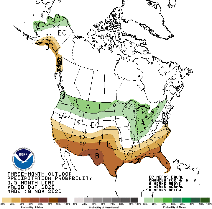 Through November 23, 2020, moderate to heavy precipitation should primarily fall on a swath from Kansas and Oklahoma through the lower Great Lakes Region, the Ohio Valley, and upstate New York. Over 1.5 inches are expected across parts of southern Illinois, central Missouri, and southeastern Kansas. Through the rest of the country, amounts over 1.5 inches should be restricted to the northern half of the immediate West Coast and the windward Cascades. Light to moderate precipitation ā from a few tenths to about an inch ā is forecast in the Sierra Nevada and the higher elevations across Idaho, western Montana, northwestern Wyoming, and central Colorado. Light to moderate precipitation could also fall on Floridaās immediate Atlantic Coast, and a few tenths of an inch should dampen the Northeast. Little or no precipitation is expected elsewhere, including most areas in the West experiencing extreme to exceptional drought. Specifically, a dry week is expected in the Southeast, the Gulf Coast, Texas, the northern Great Plains, the High Plains, lower elevations of the Four Corners States, the valleys of the Pacific Northwest, the Great Basin, and the Southwest. Meanwhile, unusually mild weather will prevail across most of the country. Most areas from the interior Atlantic Coast States through the Rockies should average at least 6 degrees F above normal, with means exceeding 12 degrees F above normal over a large area from the Plains through the Southwest. Only portions of the northern Intermountain West and West Coast can expect near to slightly below-normal temperatures…