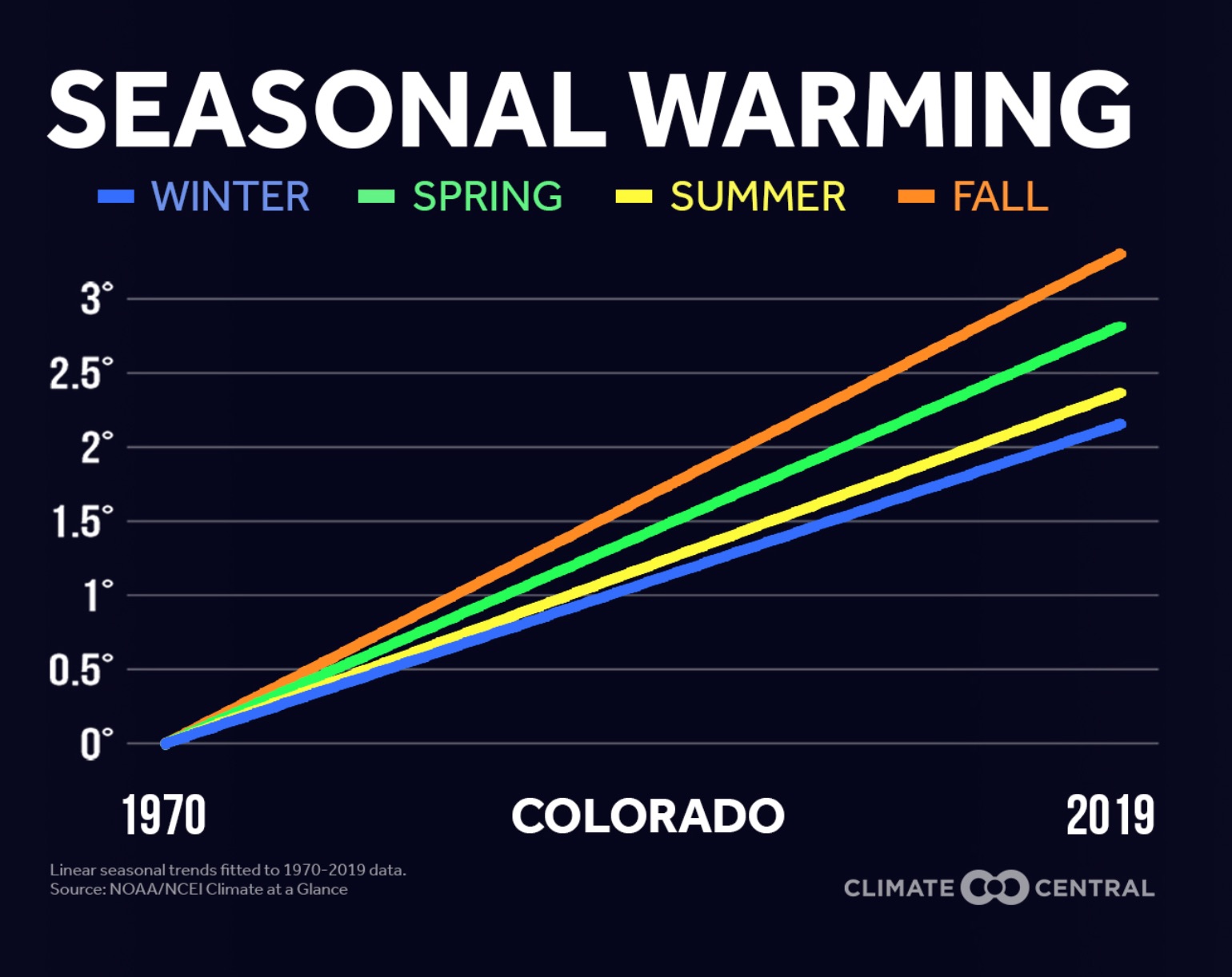 “Other areas of the country have seen much more pronounced warming in the winter months. For Colorado (and specifically Denver County), more pronounced warming trends are occurring in the summer and fall months.”