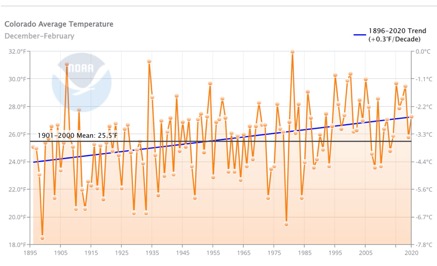 But Colorado has clearly warmed altogether, even if the evidence from the state’s largest city is wobbly. Running a chart for Colorado altogether using data from the National Oceanic and Atmosphere Administration’s Climate at a Glance tool, he produced a chart (previous page) from 1895 forward that shows (see blue line) a clear warming trend across Colorado.