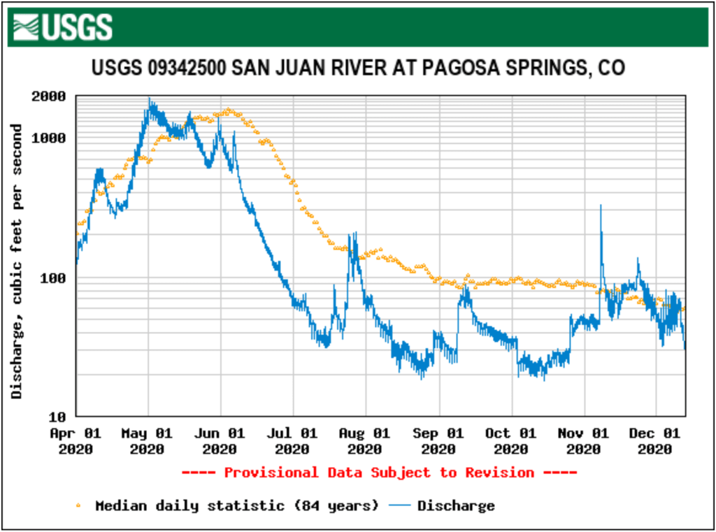 According to the U.S. Geological Survey, the San Juan River was flowing at a rate of 43.5 cfs in Pagosa Springs as of 8:30 a.m. on Wednes- day, Dec. 9.