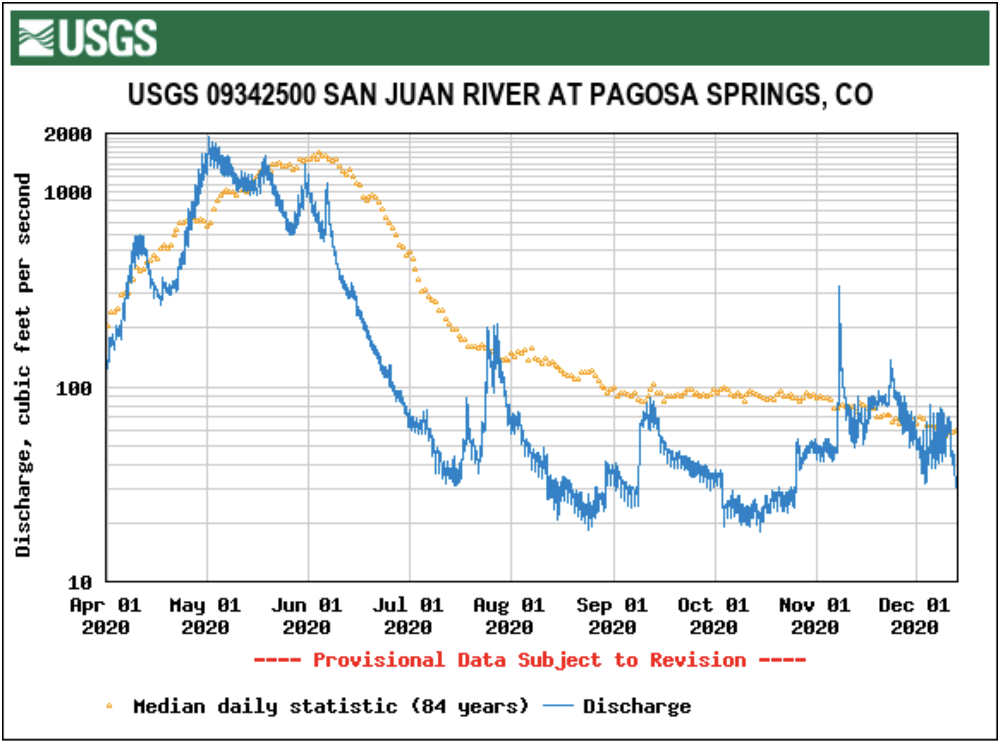 The maximum flow rate for Pagosa Springs for that date, based on 85 years of records was recorded in 2008 at 240 cfs, and the mini- mum for that date was recorded in 1957 at 14 cfs.