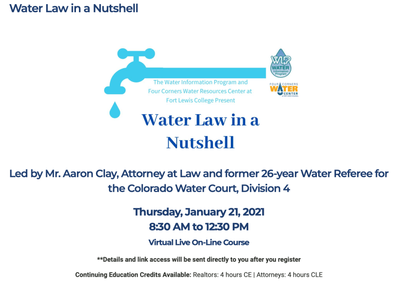 Registration is $35.00, which includes a hard copy of the Citizen’s Guide to Colorado Water Law, Citizens Guide to Interstate Compacts ($20.00 value) and course materials all mailed directly to you. **$55.00 if you wish to receive Continuing Education Credits. Includes Registration, all course materials and CE or CLE’s.