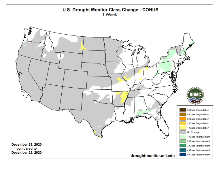Precipitation fell across much of the United States this week, with widespread moderate amounts (1-2 inches) falling on the eastern third of the CONUS, as a strong storm system moved eastward and exited the Northeast early in the week (Dec. 24-25). Ahead of the frontal boundary associated with this system, strong southerly flow resulted in a rapid warm up and heavy rainfall (2-3 inches, with locally heavier totals), leading to increased snowmelt throughout the Northeast. Behind this system, and in the following days due to lake effect, new snow blanketed many of the same locations that experienced the rapid snowmelt. Toward the end of the week, moderating temperatures led to additional snowmelt across the region. As a result, much of the Northeast saw 1-category improvements (D1 to D0, and D0 to removal). The Southeast also saw improvements in D0 coverage as the frontal boundary from this system extended all the way to the Gulf Coast as it tracked eastward. In the western CONUS, only minor improvements were made in Oregon as long-term indicators (going back to last year’s below normal rainy season) have improved enough to warrant some reduction in extreme drought (D3) coverage. Late in the week (Dec. 28-29), a storm system finally tracked southward this season, bringing above-normal weekly precipitation to coastal southern California. Unfortunately, long-term deficits (beyond 60 days) remained, foregoing D1 improvement. Status-quo was warranted from the Great Basin eastward to the Great Plains as the energy from this system propagated eastward, building upon snow water equivalent (SWE) values and preventing further deterioration; however, the precipitation that did fall was not enough to improve conditions either. In the Northern Plains, snowpack remains well below-normal, leading to some minor degradation in areas where temperatures averaged above freezing and winds were gusty. Elsewhere, the time of year has minimized degradation of drought in many locations, with low temperatures, little or no evapotranspiration, and frozen ground (upper Midwest and Great Plains).