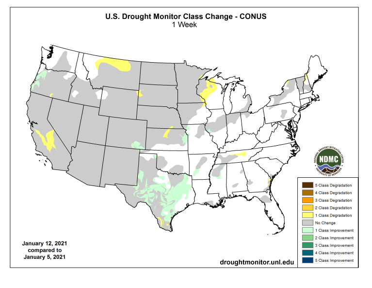The South was hit with another winter storm this week, spreading rain and snow from Texas to Mississippi. Widespread snow fell across much of East Texas and northern Louisiana, with totals generally ranging from 2 to 5 inches, with isolated higher amounts near 6 inches across portions of deep East Texas and west-central Louisiana. As a result, one-category improvements were made across much of the state. The rain and snow even helped chip away at the extreme (D3) and exceptional (D4) areas inthe western part of the state as soil moisture and groundwater began to improve. Drought conditions deteriorated in far South Texas, which has experienced warmer than normal temperatures, combined with rainfall less than 25% of normal over the last 90 days. To the east, rain and snow helped improve parts of the abnormally dry areas in southwest Arkansas and central Mississippi…