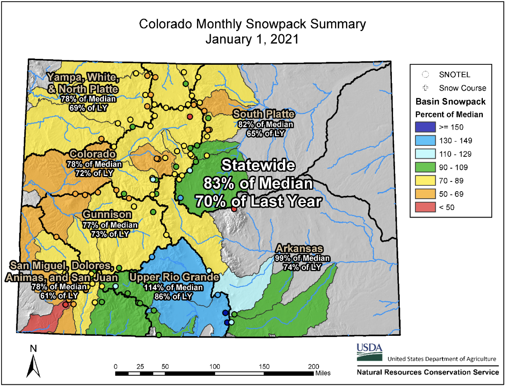 While the Pacific Northwest saw continued wet weather, the Southwest remained dry. One-category improvements were made in west Oregon, where 125% to 300% of normal precipitation has fallen since the beginning of the year. This has led to improvements in streamflow and groundwater. East of the Cascades, water year-to-date precipitation is well below normal, resulting in extremely low streamflows and degradations to exceptional (D3) drought in south-central Oregon. In the Southwest, moderate (D2) and extreme (D3) drought expanded in central California where water year-to-date precipitation is less than 25% of normal. With the exception of an expansion of abnormal dryness (D0) in northern Montana, the rest of the West remained unchanged. Once again, many state drought teams noted that in areas where rain and snow fell, it wasn’t enough to increase moisture availability. In areas where it didn’t, such as the Southwest, the conditions either didn’t yet warrant additional degradations or, because they were already in exceptional drought (D4), could not be degraded further. Snowpack and snow-water equivalent are well below normal and soils are dry. Ranchers have noted that natural forage is insufficient or depleted…