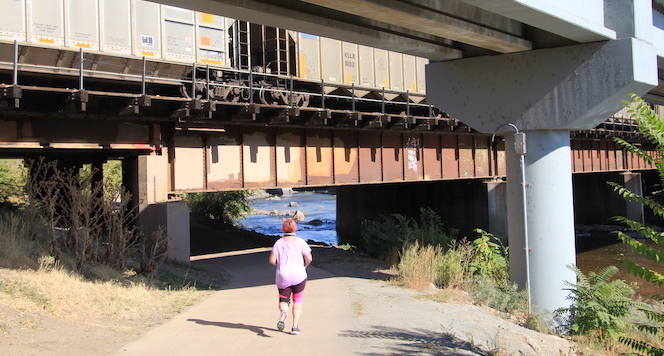 A woman jogs along the South Platte River underneath highways and railroad tracks near downtown Denver. Photo credit: Allen Best