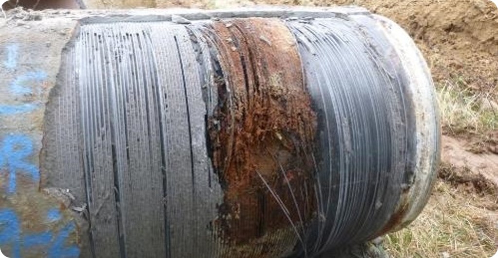 This photo is an example of a prestressed concrete cylinder pipe with wire damage. Photo credit: Denver Water.