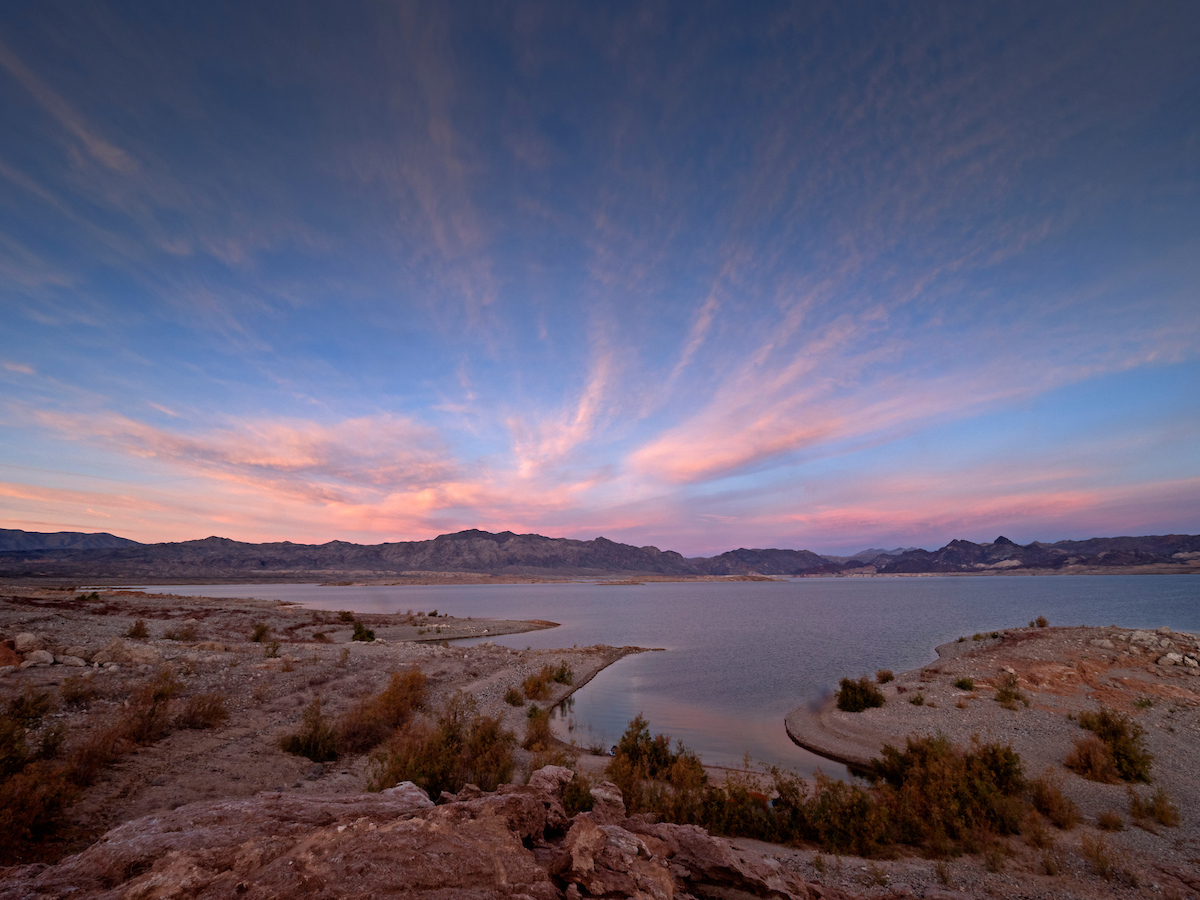 Sunrise illuminates clouds over the Black Mountains along the Virgin Basin on Lake Mead in the Lake Mead National Recreation Area on the Arizona-Nevada border (Photo from Arizona looking into Nevada Lake Mead, AZ | by Colleen Miniuk via American Rivers)Graphic via Holly McClelland/High Country News.