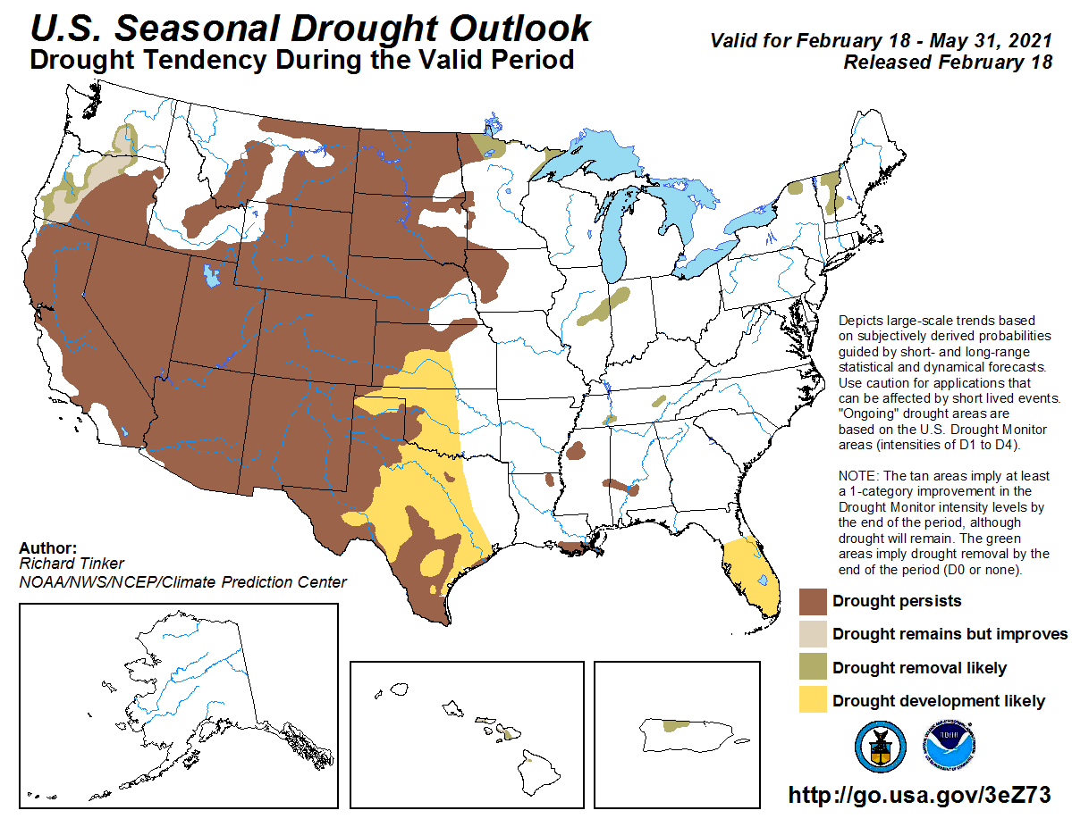 #Drought news (February 18, 2021): Beneficial precipitation fell on higher elevations of #Nevada, central #UT, W. and E. #WY, W. #Colorado, N.E. #AZ, and most of #NM