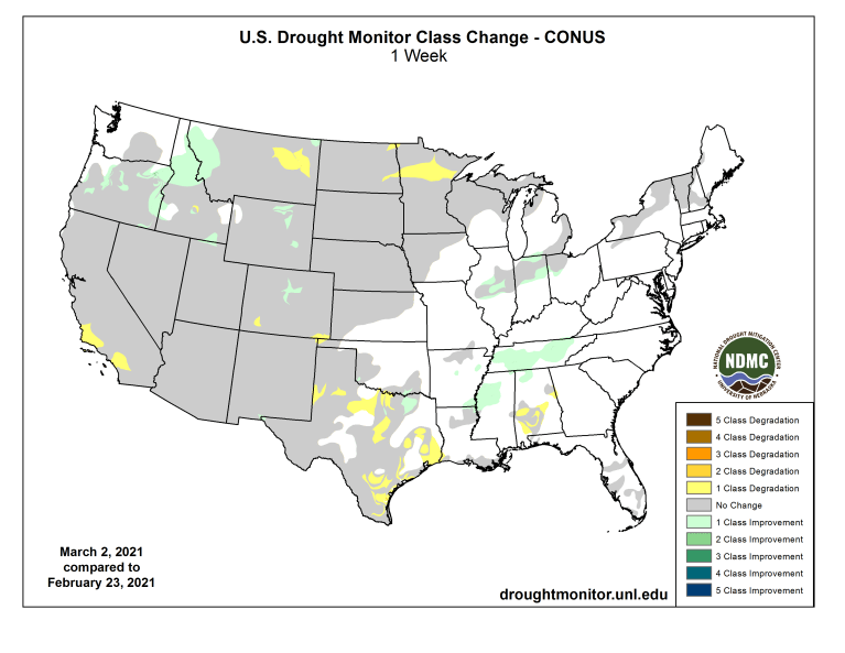 Here’s the one week change map ending March 2, 2021.