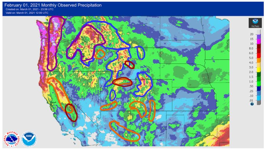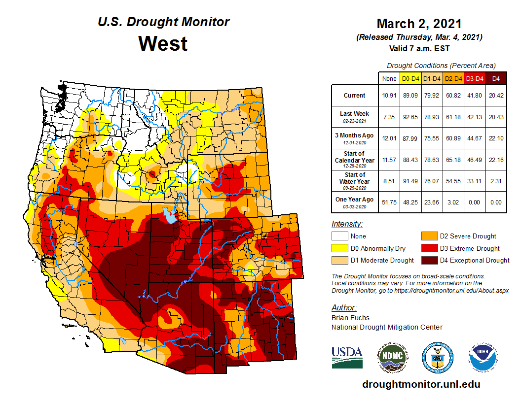 Dry conditions dominated areas from California to New Mexico with just a few pockets of above-normal precipitation over central Colorado, central Wyoming, the Pacific Northwest, and northern Montana. Temperatures were cooler than normal over much of the region with much of the Great Basin and into Wyoming recording temperatures 9-12 degrees below normal. After a good month of precipitation along with the most recent precipitation in the area, many areas of Oregon saw improvements to the drought status, with long-term issues still being monitored. Much of California is enduring its second consecutive dry winter, with most areas below 75% of normal snowpack for this time of year. Many water agencies were discussing water conservation measures, with the North Marin Water District considering both voluntary and mandatory water conservation orders. Moderate drought was expanded over areas of southern California where drought is beginning to develop again after a fairly dry winter. Improvements to abnormally dry, moderate and severe drought conditions were made in Idaho while abnormally dry conditions were improved over western Montana. Eastern Montana conditions continued to deteriorate with an expansion of moderate and severe drought this week. A recent winter storm in and around the Denver metro area and areas to the west allowed for improvements to the extreme drought conditions there as snow totals for the current water year were up over 100%…
