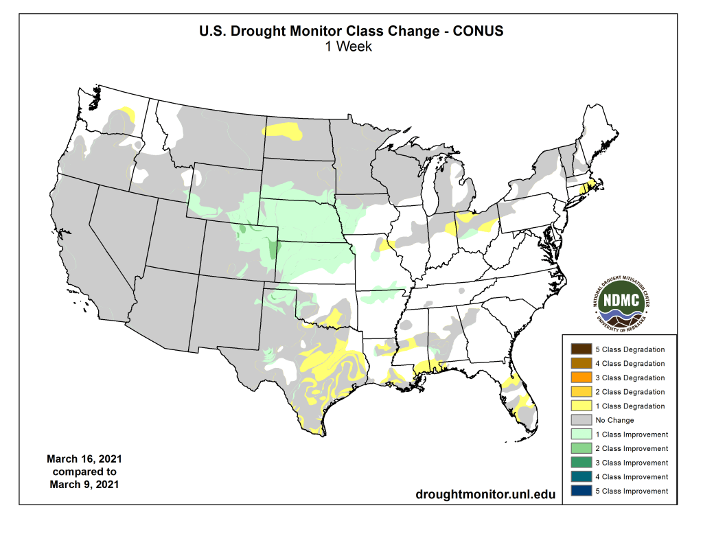 US Drought Monitor one week change map ending March 16, 2021.