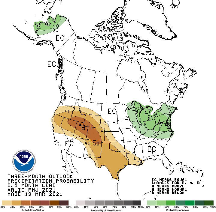 The National Oceanic and Atmospheric Administration’s official spring outlook Thursday sees an expanding drought with a drier than normal April, May and June for a large swath of the country from Louisiana to Oregon. including some areas hardest hit by the most severe drought. And nearly all of the continental United States is looking at warmer than normal spring, except for tiny parts of the Pacific Northwest and southeast Alaska, which makes drought worse…
