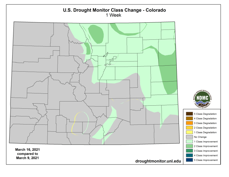 US Drought Monitor one week change map for Colorado ending March 16, 2021.