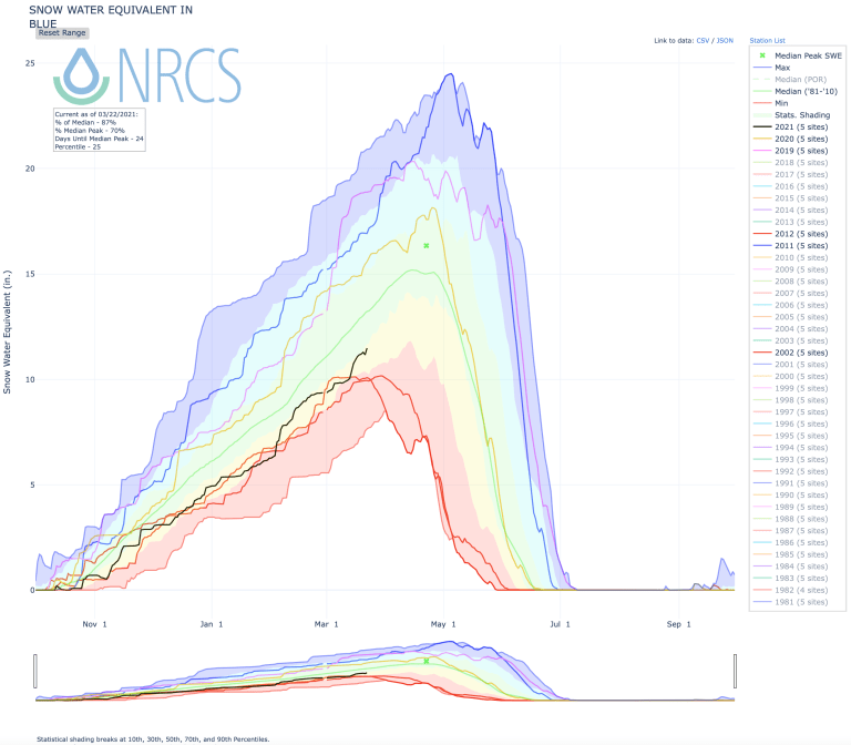 Blue River sub-basin SWE March 22, 2021 via the NRCS.