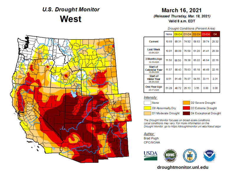 West drought time series ending March 18, 2021 via the US Drought Monitor.