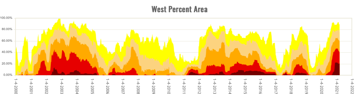 The trajectory of this drought episode remains unclear, but scientists say that it is actually part of a bigger megadrought — a decades-long dry spell, punctuated by severe droughts. This megadrought began around 2000, and as the chart below shows, the majority of land in the West has been in some level of drought ever since.
