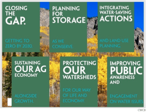 The broad priorities of the Colorado Water Plan as put forward by Becky Mitchell in a June 20, 2017 presentation to three Front Range roundtables. The slide reflects the competing priorities in Colorado when it comes to water and rivers.