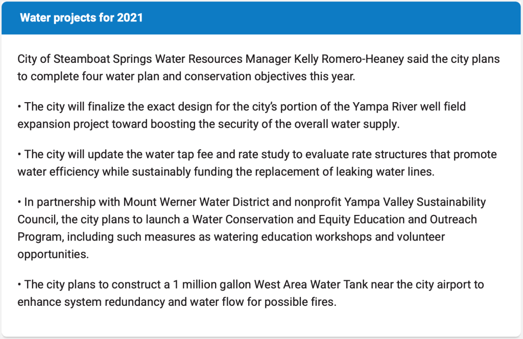 [Romero-Heaney] said the city accomplished six key water conservation measures in 2020. Steamboat Springs City Council and the district adopted regulations that permanently limit outdoor watering to between 6 p.m. and 10 a.m. three days per week based on the last digit of a street address. The city replaced 619 feet of aging and possibly leaking water lines, fixed five water main breaks and replaced irrigated sod in front of City Hall with a low water use demonstration garden.