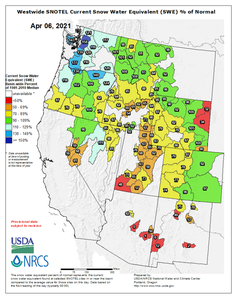 Westwide SNOTEL basin-filled map April 6, 2021 via the NRCS.