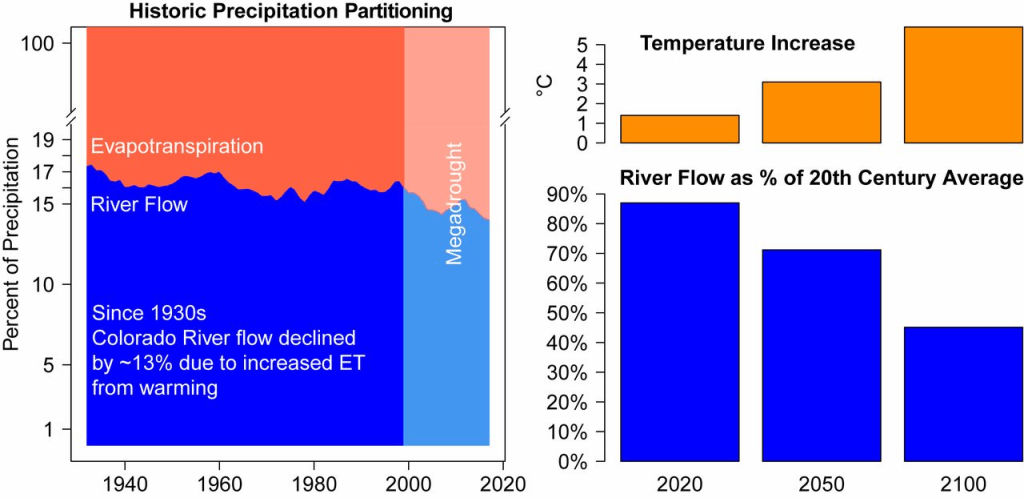 Climate change is causing the Southwest to aridify. (Left) Since the 1930s, increasing temperatures have caused the percentage of precipitation going to evapotranspiration (ET) to increase at the expense of precipitation going to Colorado River flow, resulting in an unprecedented and still ongoing megadrought (shading) starting in 1999 (8). (Right) Higher temperatures have already reduced Colorado River flow by 13%, and projected additional warming, assuming continued high emissions of greenhouse gases, will increase ET while reducing river flow even more through the 21st century. Data on Left are 20-y running means from ref. 5, and data on Right are calculated from Representative Concentration Pathways (RCP) 8.5 multimodel Coupled Model Intercomparison Project–Phase 5 (CMIP5) ensemble temperature increases projected for the Upper Colorado River Basin combined with temperature sensitivity of −9.3%/°C estimated by ref. 5, assuming no change in precipitation.