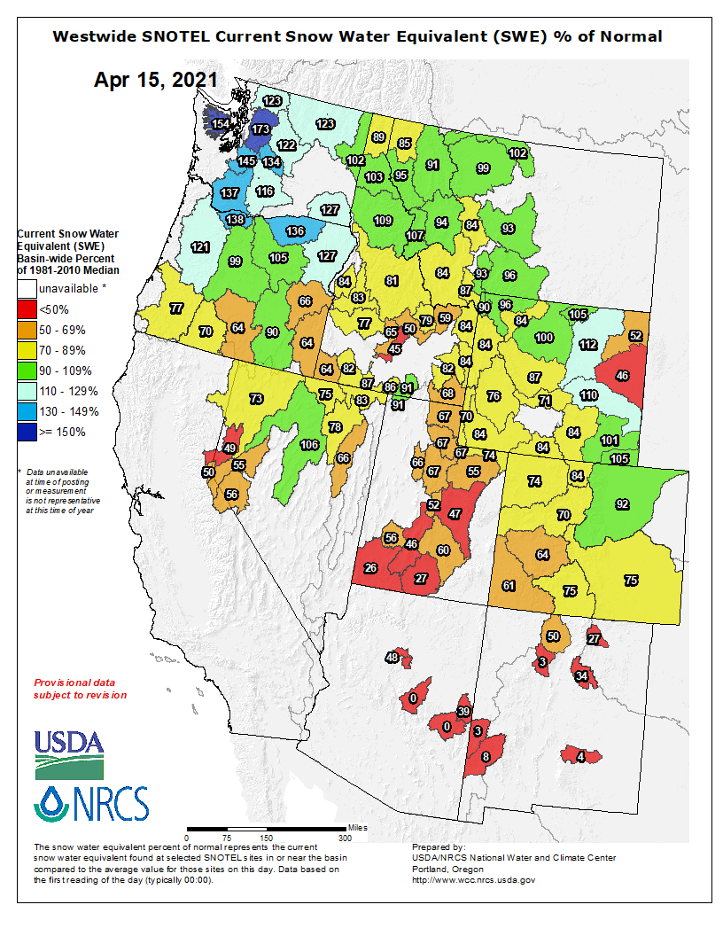 Westwide SNOTEL basin-filled map April 15, 2021 via the NRCS.