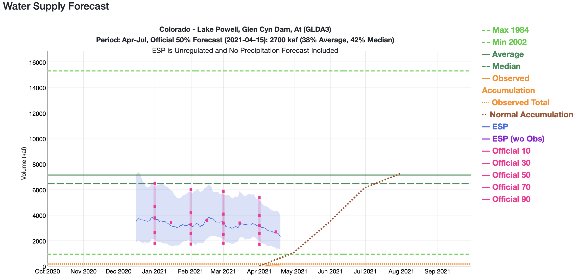 For the first year, Reclamation uses “unregulated” runoff forecasts generated by the Colorado Basin River Forecast Center (CBRFC) model. Unregulated inflow is not the same as natural inflow. The CBRFC does its best to adjust the forecasts for upstream diversions and for the many reservoirs that are not included in the 24-month study model. Inflow forecasts for the second year of the 24-month studies are not based on the CBRFC model. Instead, Reclamation, in consultation with CBRFC, uses statistics from the past and its judgment. Running the 24-month study model then simulates the operation of the upstream reservoirs such as Navajo, Blue Mesa, and Flaming Gorge, turning unregulated inflow to Powell into “regulated” inflow. For example, from the April ‘21 most probable study, the WY 2021 unregulated inflow to Powell is 4.897 MAF, regulated inflow is 4.908 MAF. These numbers are close, but in WY 2020 regulated inflow exceeded unregulated inflow by about 700,000 acre-feet.