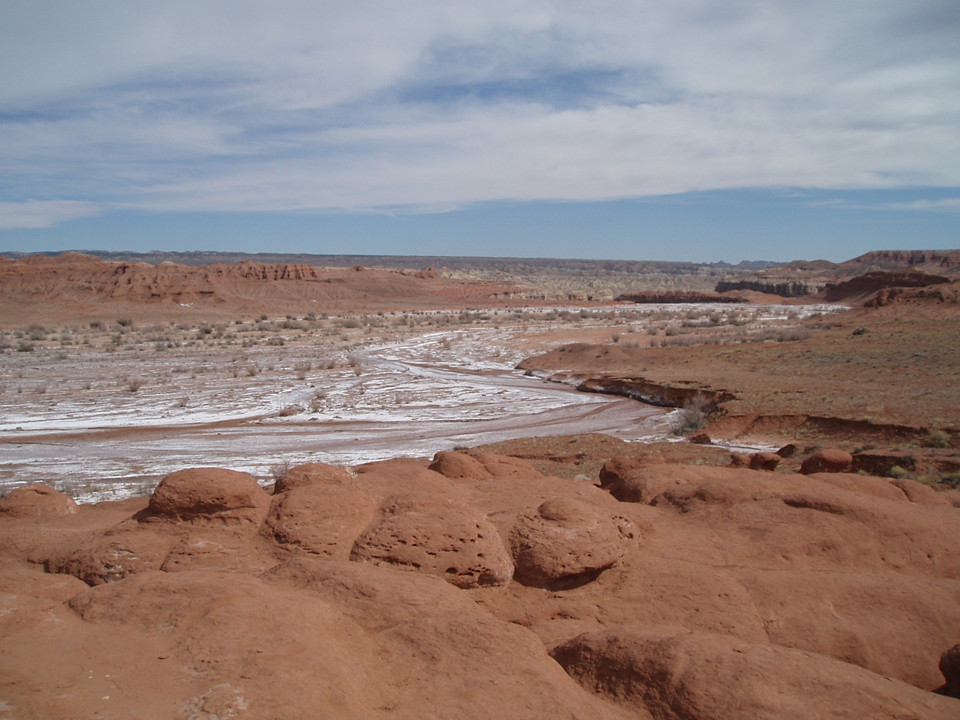 Landscape view of the San Rafael River in Utah. Courtesy: Wyatt Brown. Public Domain.White salts covers the surface of the San Rafael Swell, Utah. Credit: USGS. Public domain.