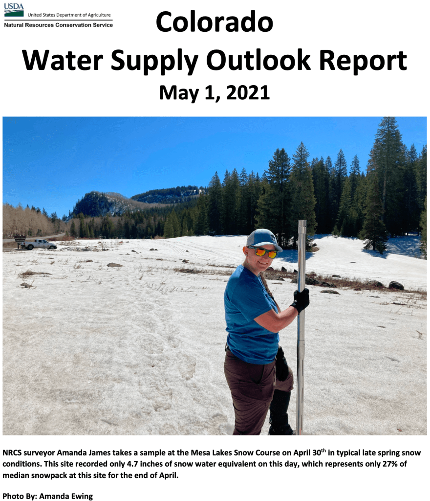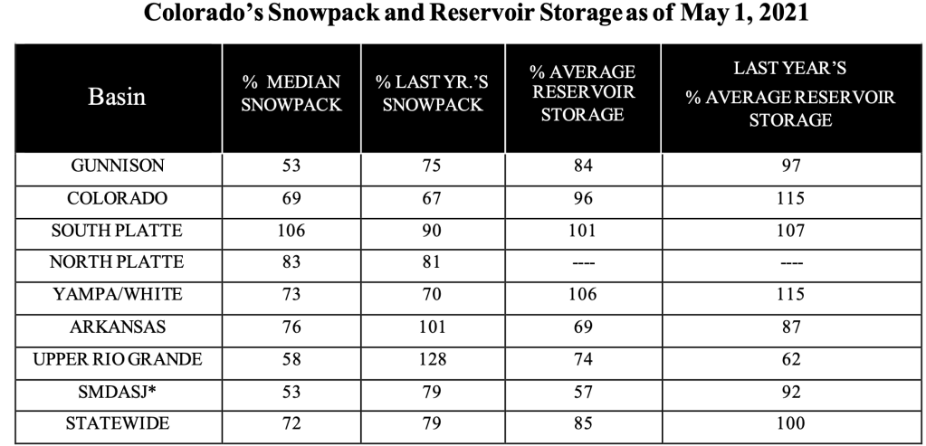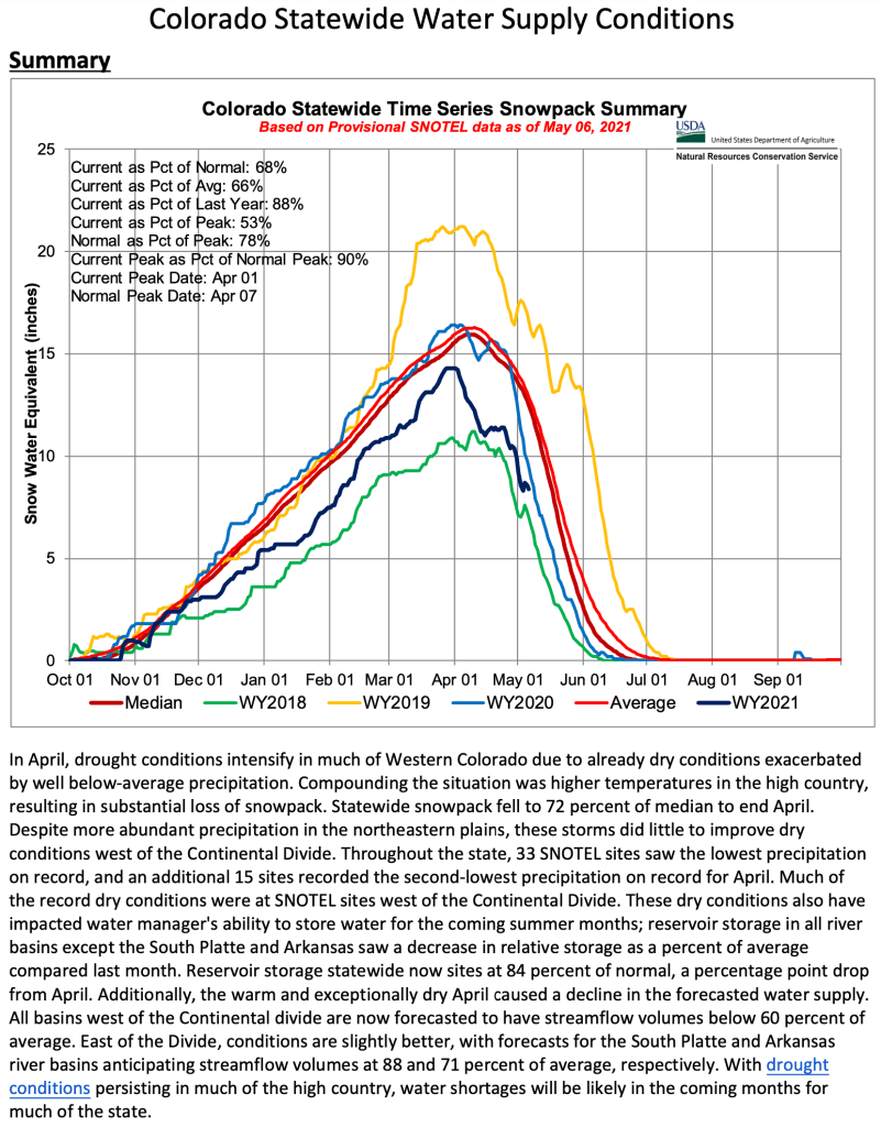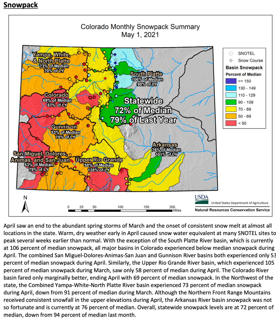 Recent precipitation that has helped improve water supply in the South Platte river basin has had little impact on the rest of the state. Dry conditions have persisted in much of the state since last summer, and a dry April only compounded current drought conditions. NRCS Hydrologist Atwood continued to comment that “With much of the snowpack in many basins already melted out, persistent dry soil conditions, and little hope for substantial precipitation moving into summer, runoff volumes will continue to be meager.” All basins west of the continental divide are forecasted to have streamflow volumes between 34 and 73 percent of average. The South Platte river basin, which has the best water supply outlook in the state, has streamflow volume forecasts range from 90 to 104 percent of average.