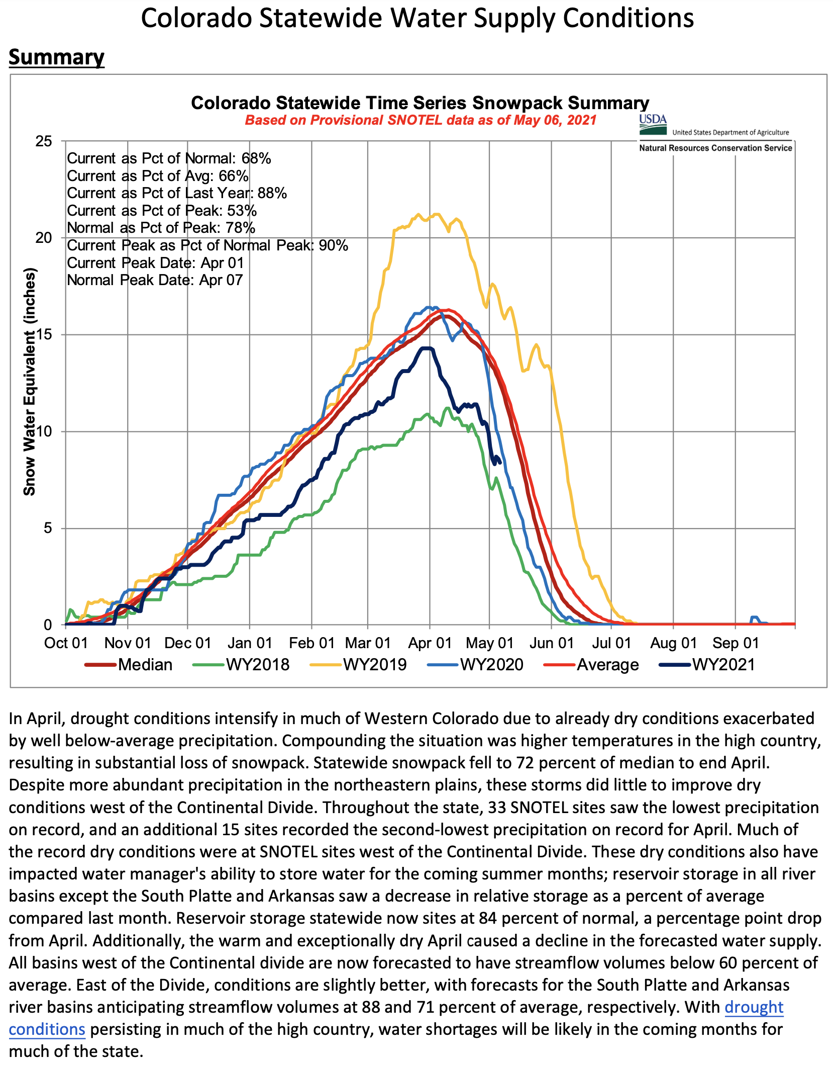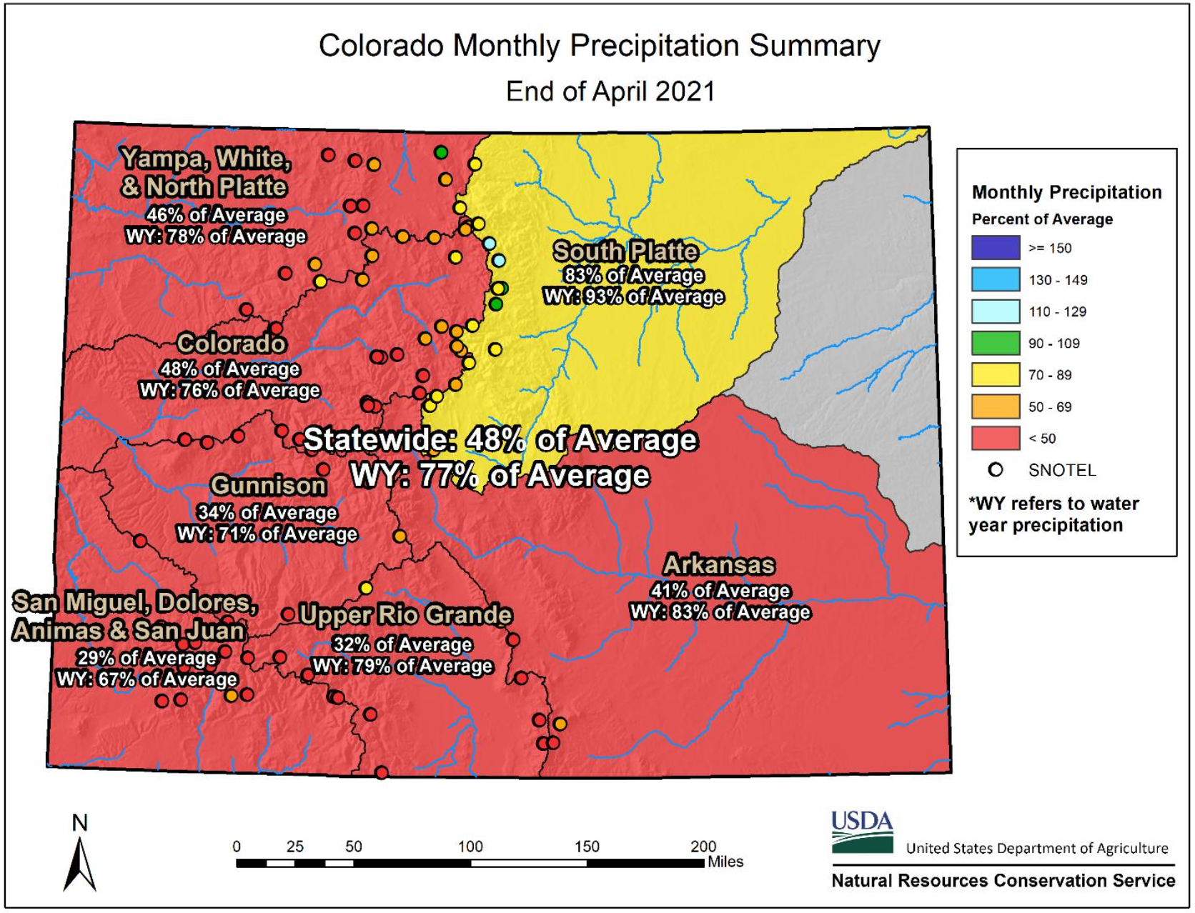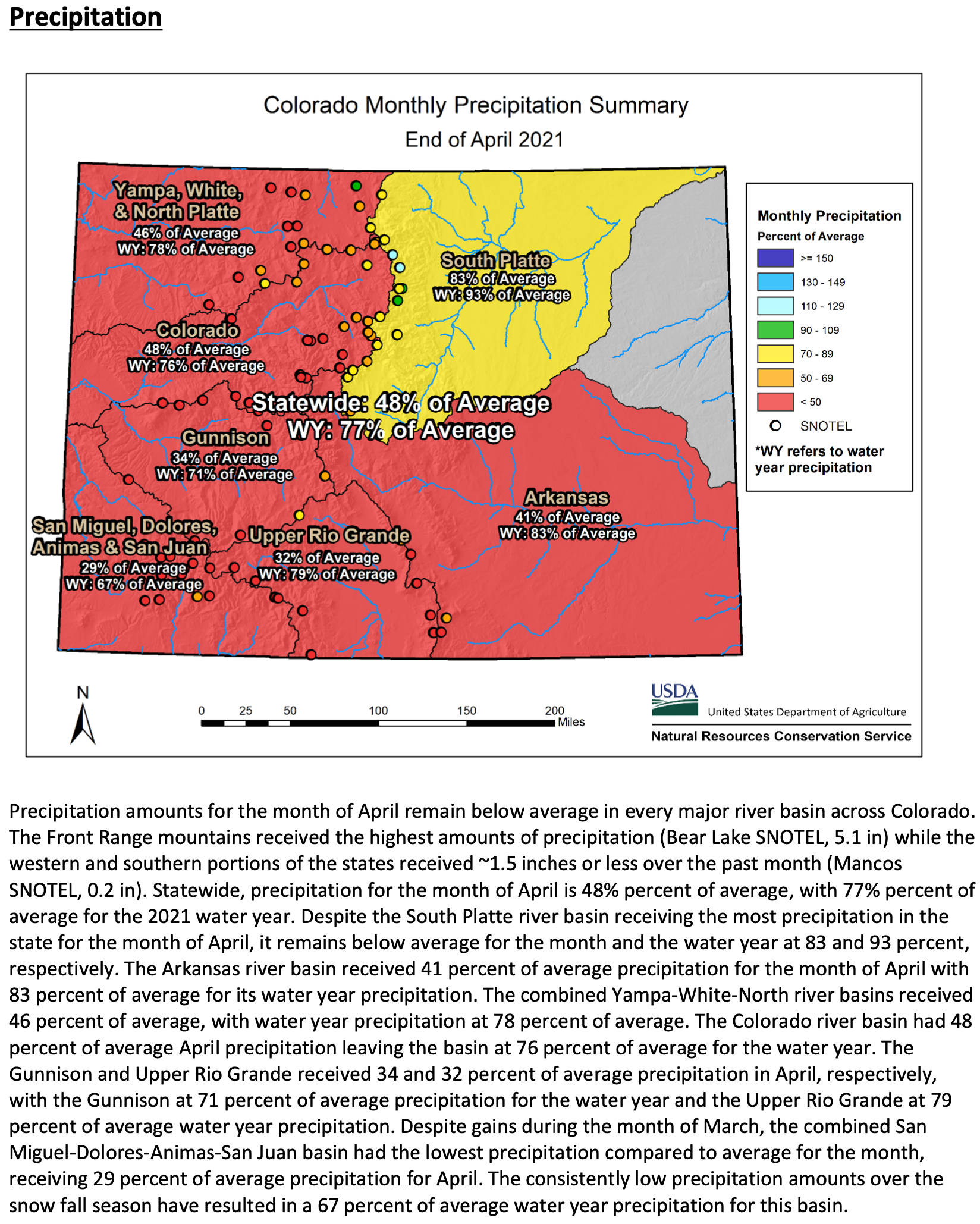 An exceptionally dry April, along with warmer mountain temperature exacerbated already dry conditions in much of Colorado. Precipitation in April ranged from a high of 83 percent of average in the South Platte River Basin to as low as 29 percent of average in the combined San Miguel-Dolores-Animas-San Juan river basin. NRCS Hydrologist Joel Atwood notes, “Many SNOTEL sites reported record low precipitation for April west of the Continental Divide. Snowpack has also declined in all basins except the South Platte, due to higher temperature and below-average precipitation.” As of May 9th, all basins in the state have snowpack below 80 percent of median except the South Platte river basin, which has 102 percent of median snowpack.