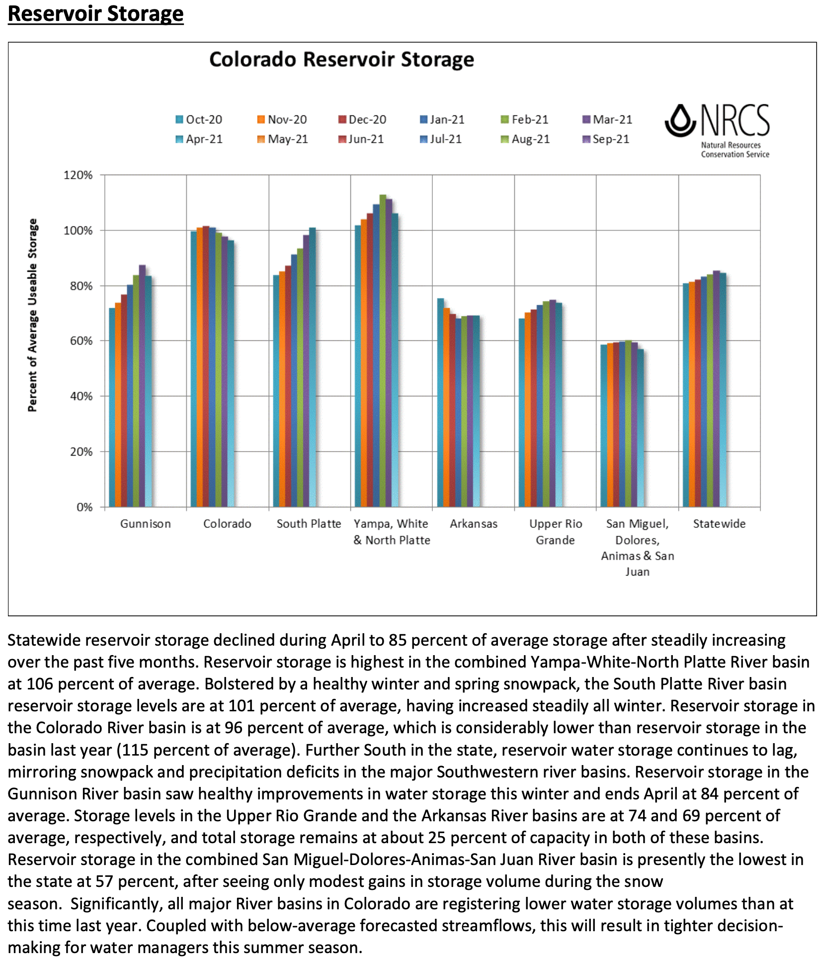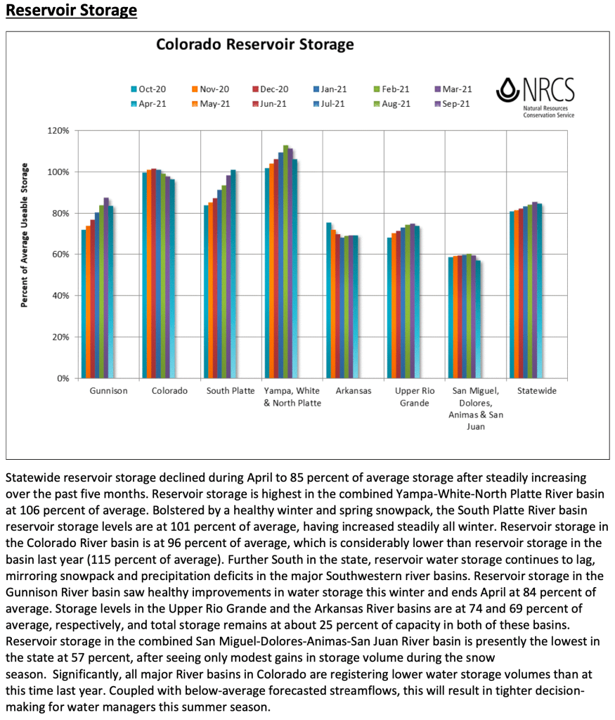Statewide reservoir storage declined by a percentage point over last month, where all basins except the South Platte river basin saw a decline in relative storage. The combined Yampa-White-North Platte and the South Platte river basins ended April with above-average storage at 106 and 101 percent of average, respectively. On the low end, the combined San Miguel-Dolores-Animas-San Juan and the Arkansas river basins ended April with 57 and 69 percent of average reservoir storage, respectively.
