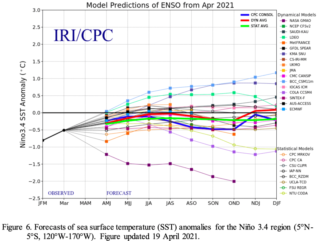 ENSO Alert System Status: Final La Niña AdvisorySynopsis: La Niña has ended, with ENSO-neutral likely to continue through the Northern Hemisphere summer (67% chance in June-August 2021).