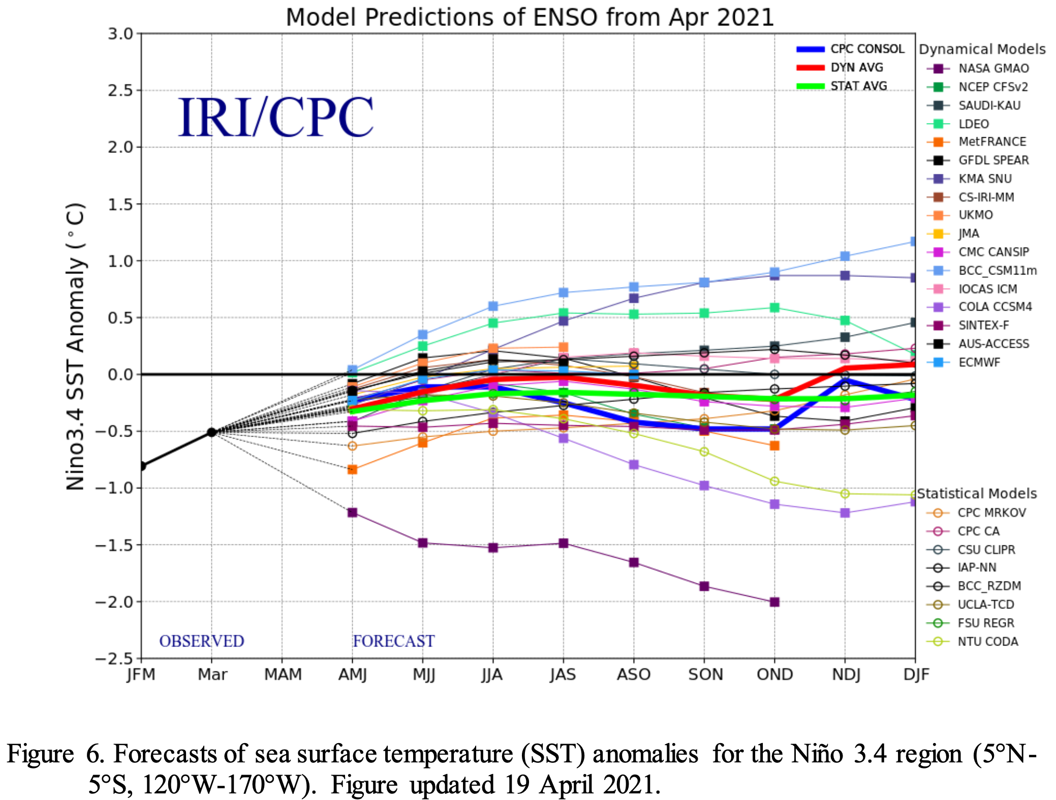 Most of the models in the IRI/CPC plume predict a continuation of ENSO-neutral through the Northern Hemisphere summer 2021. The forecaster consensus agrees with this set of models through the summer, and then begins hedging toward cooler conditions as the Northern Hemisphere fall approaches. La Niña chances are around 50-55% during the late fall and winter, which is in alignment with forecasts from the NCEP Climate Forecast System and North American Multi-model Ensemble. However, there is typically large uncertainty with forecasts made in the spring, so confidence in ENSO-neutral for the coming seasons is highest. In summary, La Niña has ended, with ENSO-neutral likely to continue through the Northern Hemisphere summer (67% chance in June-August 2021; click CPC/IRI consensus forecast for the chances in each 3-month period).