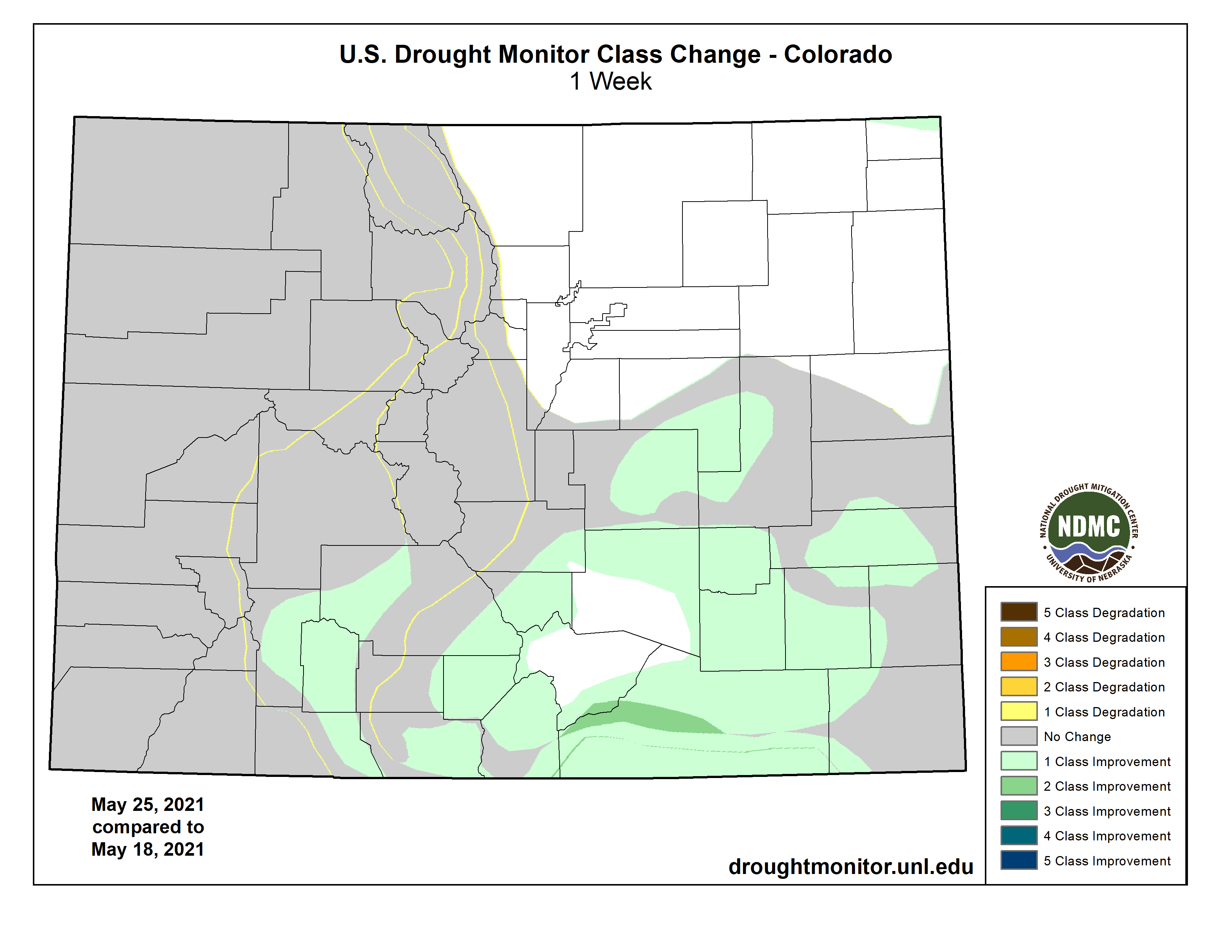 Colorado Drought Monitor one week change map ending May 25, 2021.