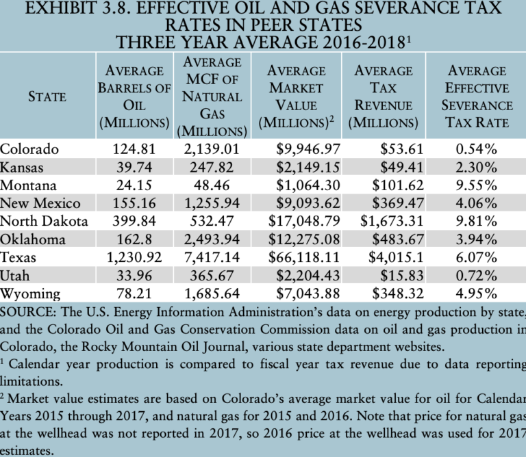 This table from the January 2020 severance taxes audit from the Colorado Office of the State Auditor shows the average effective oil and gas severance tax rates from 2016 to 2018 in Colorado and eight other peer states. Coloradoās, at 0.54%, was the lowest. (Colorado Office of the State Auditor)