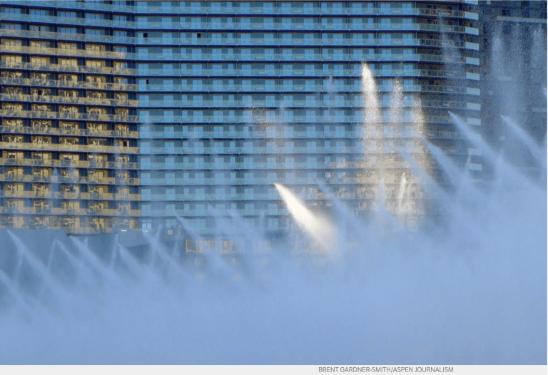 An elaborate fountain in Las Vegas. One of the biggest water meetings of the year takes place every December in Las Vegas, which has driven down water use down by paying people to remove thirsty turf and grass. Photo credit: Brent Gardner-Smith/Aspen Journalism