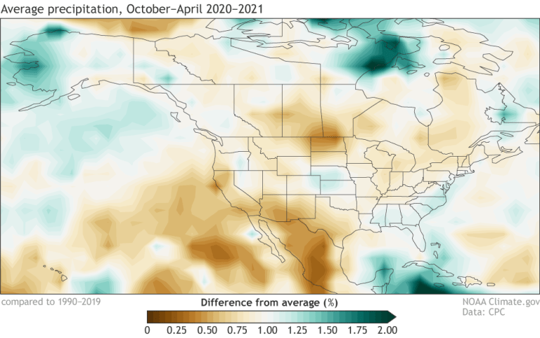 Percent of average precipitation (rain, snow, and other frozen precipitation) during October–April 2020–21. Average period is 1990–2019. Data from GPCP via ESRL PSL; image by climate.gov.