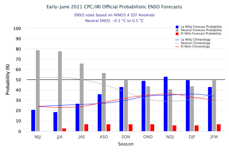 ENSO-neutral conditions are present in the tropical Pacific, and NOAA forecasters think they’re likely to continue through the summer. Neutral is slightly favored through the fall, although it’s a close call between continued neutral and re-developing La Niña for the late fall and winter.