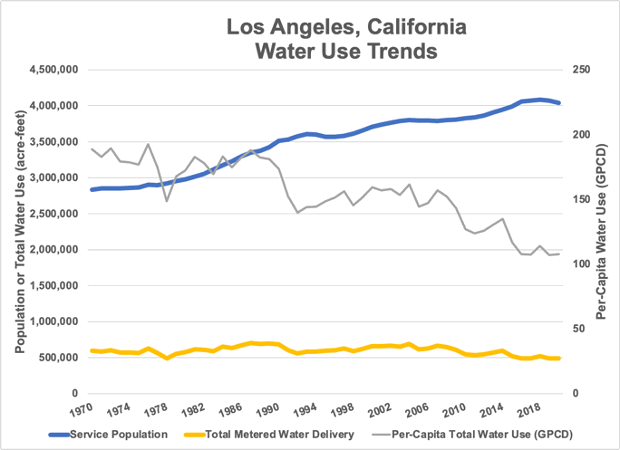 Over the past 50 years, the City of Los Angeles has been able to reduce its total water use by 23% even while its population grew by 43%. The City was able to accomplish this largely by incentivizing its residents to reduce their per-capita water use by more than 40%. (Data and statistics from Richter and others, 2020)