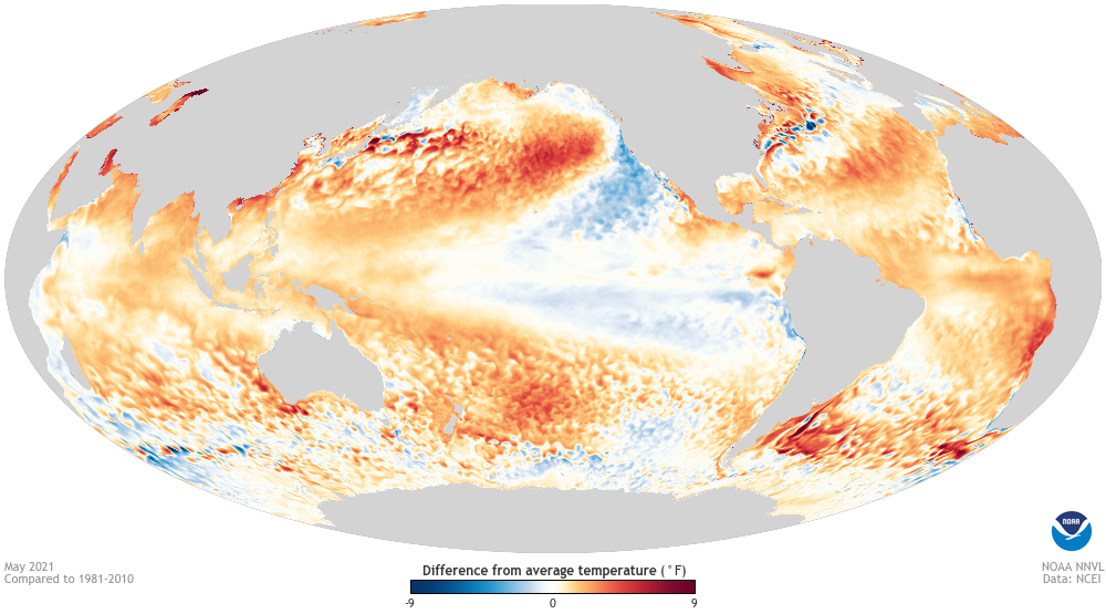 May 2021 sea surface temperature departure from the 1981-2010 average (note that this image still uses the previous averaging period). Image from Data Snapshots on Climate.gov.