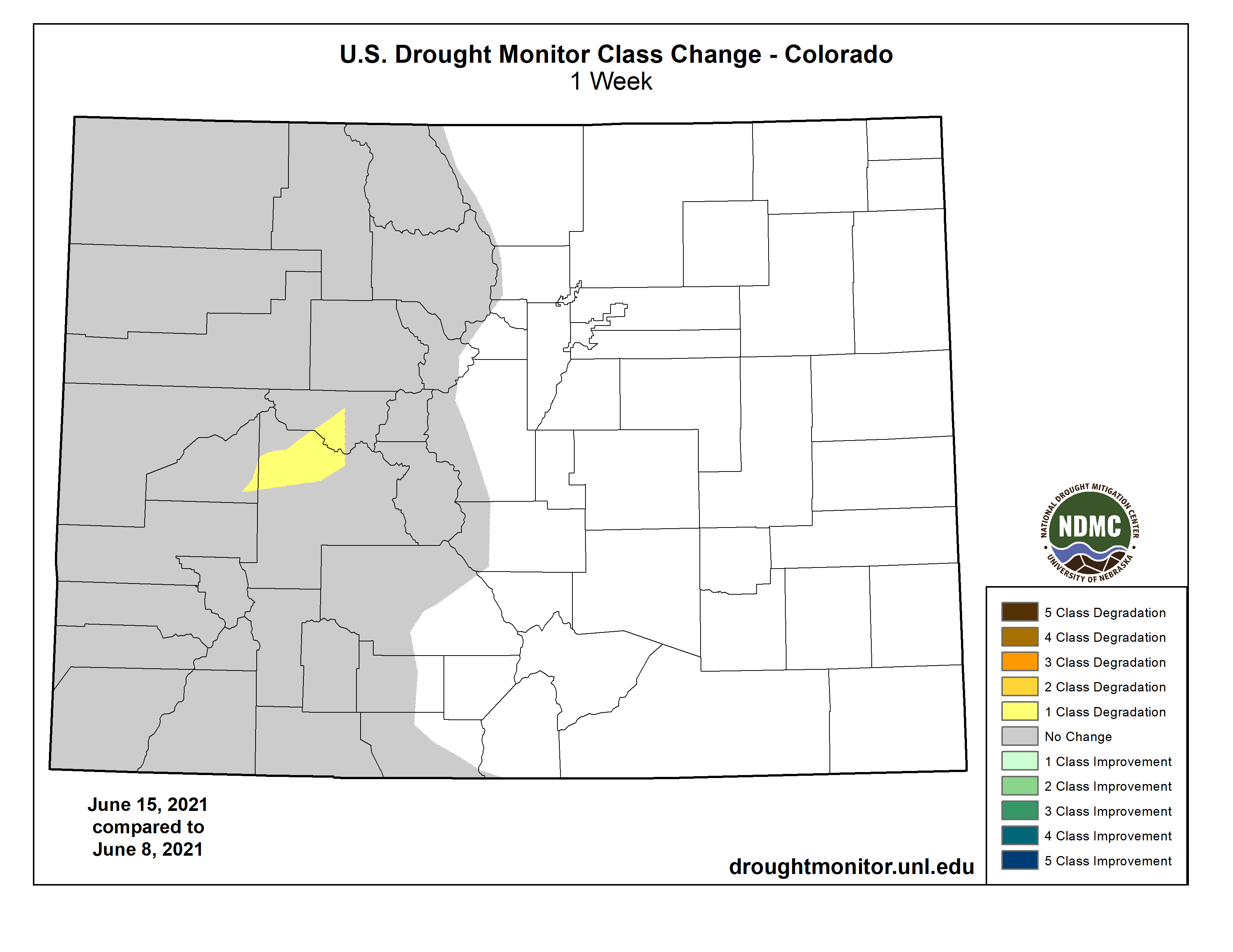 Colorado Drought Monitor one week change map ending June 15, 2021.