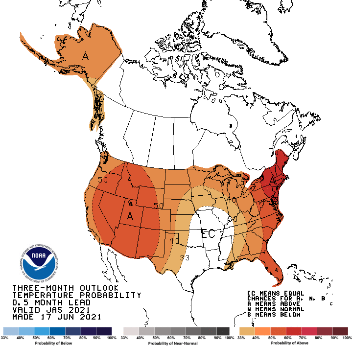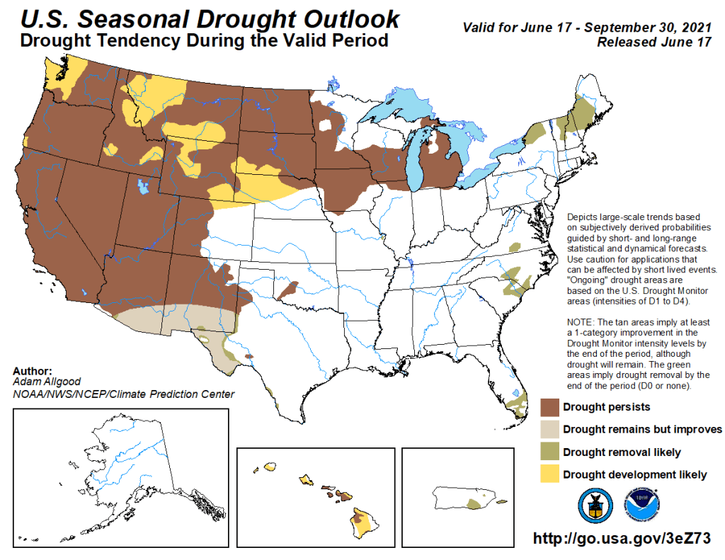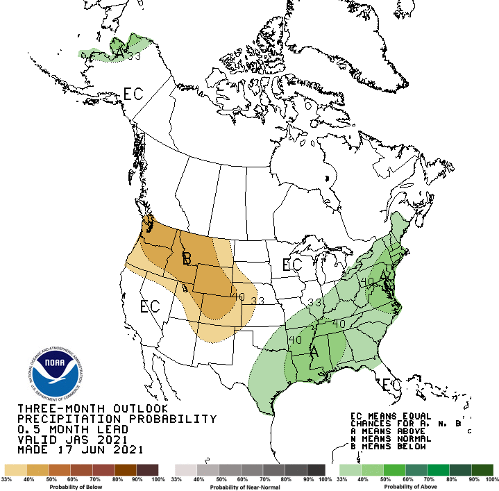 As of June 16, the National Weather Service (NWS) Weather Prediction Center is forecasting two areas of significant precipitation through the evening of June 21. One area of forecast rain covers much of the Great Lakes and Ohio Valley regions, and could be highly beneficial to southern Wisconsin and northern Illinois if it occurs. Large rain amounts are also forecast from the central Gulf Coast to Georgia, northwest Florida, and western South Carolina, in association with a tropical disturbance being monitored by the NWS National Hurricane Center as of the afternoon of June 16th. For more information on this system, please monitor forecasts from the National Hurricane Center, the Weather Prediction Center, and your local National Weather Service forecast. The NWS Climate Prediction Center forecast for June 22-26 favors above normal precipitation in the western Great Lakes, lower Missouri River Valley, and the Southeast (excluding South Florida), while below normal precipitation is favored in the Pacific Northwest, Intermountain West, and North Dakota. During this period, warmer than normal temperatures are favored in the western Great Plains and West, while below normal temperatures are more likely from the Great Lakes to the central and eastern Gulf Coast). In Alaska, above normal temperatures are favored in the north from June 22-26, below-normal precipitation is favored in east-central Alaska, while above normal precipitation is favored elsewhere in the state.