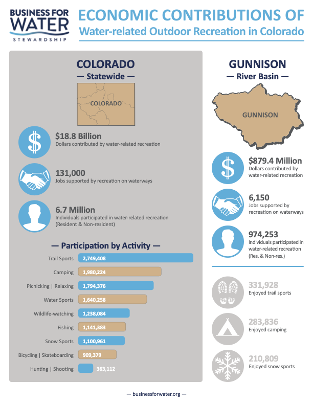 The Tomichi Water Conservation Program involves regional coordination between six water users on lower Tomichi Creek to reduce consumptive use on irrigated meadows as a watershed drought management tool. The project will use water supply as a trigger for water conservation measures during one year in the three-year period. During implementation, participating water users would cease irrigation during dry months. Water not diverted will improve environmental and recreational flows through the Tomichi State Wildlife Area and be available to water users below the project area. Photo credit: Business for Water.