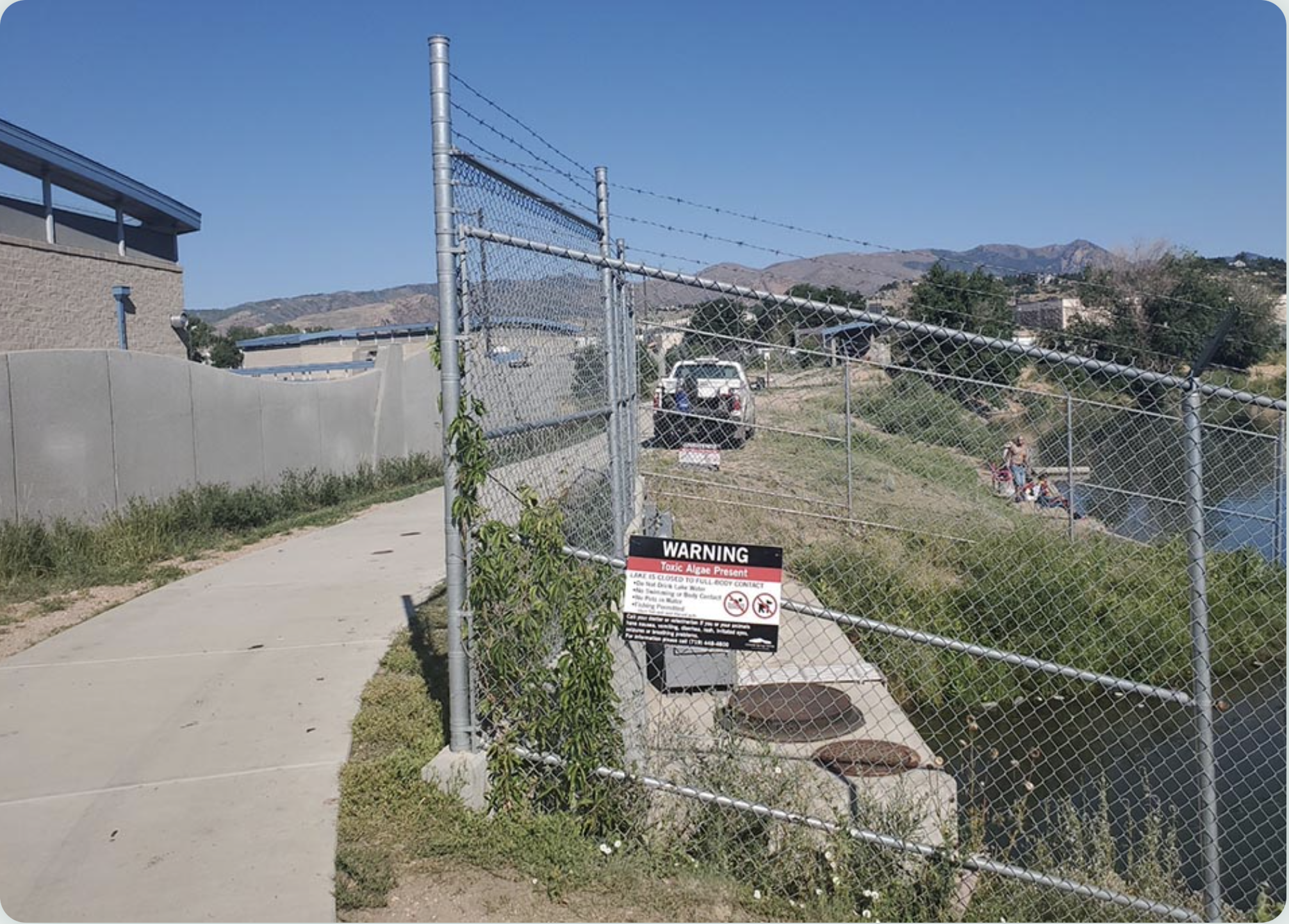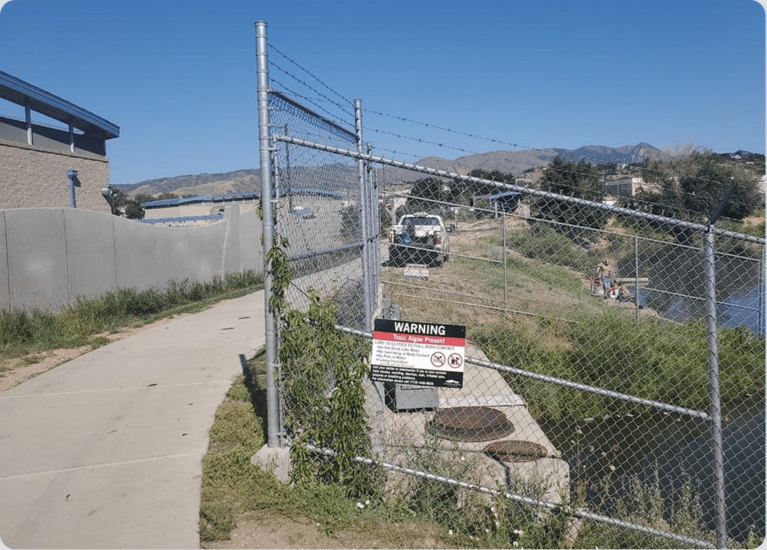Warning sign for Blue-green algae at Pikeview Reservoir July 2021. Photo credit: Colorado Springs Utilities