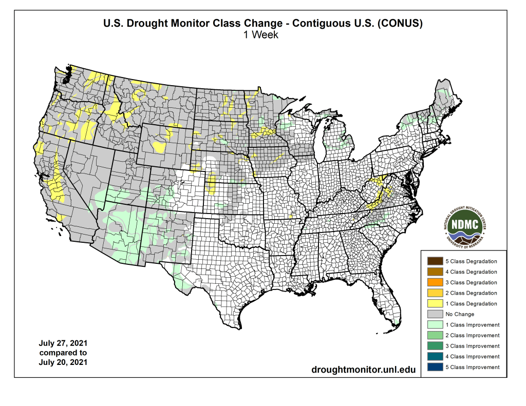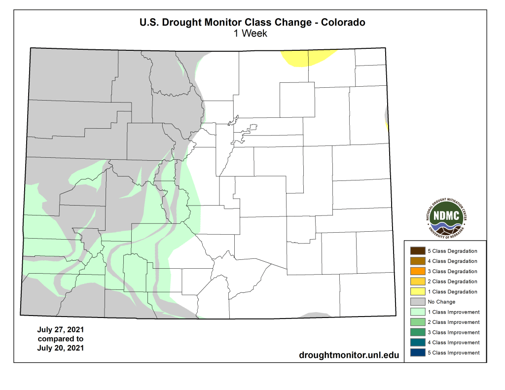 Colorado Drought Monitor one week change map ending July 27, 2021.