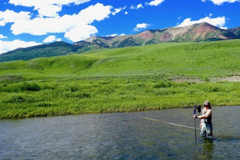 Desert Research Institute scientist Rosemary Carroll measures stream discharge in the East River, Colorado. Credit: Kenneth H. Williams via the Desert Research Institute