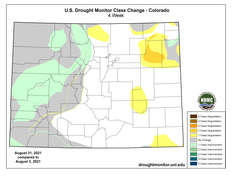 Colorado Drought Monitor one month change map ending August 31, 2021.