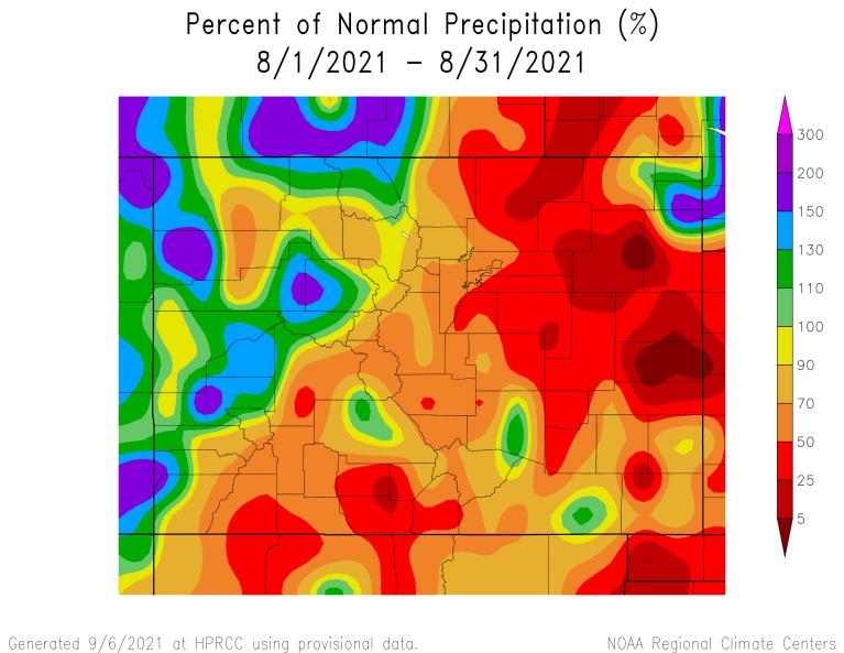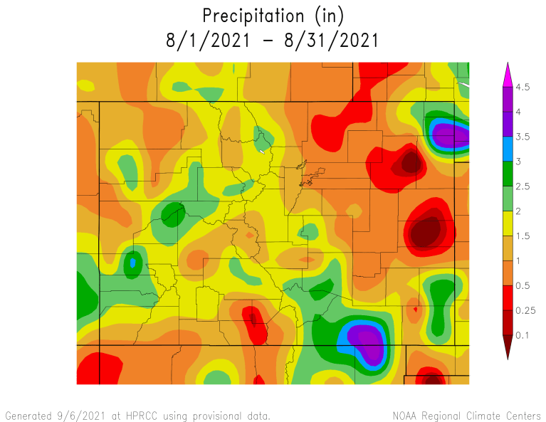Statewide, eastern Colorado was hot and dry this month and western Colorado was wet and cool.
