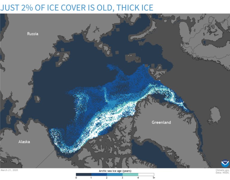 At the annual maximum ice extent in March 2020, only 2% of the Arctic ice cover consisted of old, thick ice (white). Most of the ice cover consist of ice that was less than a year oldāi.e. seasonal ice that doesnāt survive the summer. NOAA Climate.gov image, based on data from the National Snow and Ice Data Center.