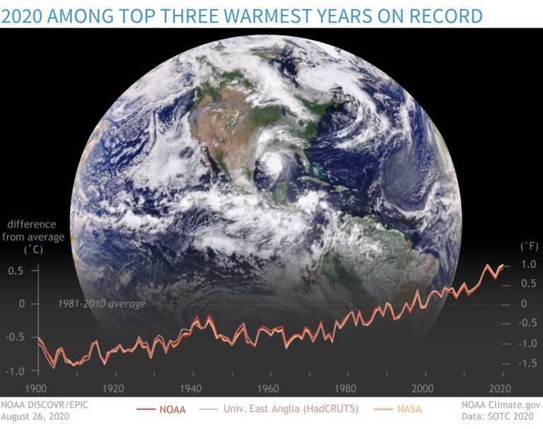 Global surface temperature each year compared to the 1981-2010 average from three datasets: NOAA (red line), NASA (orange), and University of East Anglia (pink). The background image from the NOAA DISCOVR/EPIC mission shows Hurricane Laura coming ashore in Louisiana on August 26, 2020. Image by NOAA Climate.gov, adapted from State of the Climate in 2020. [Correction (08-25-21): The original version of this graphic and the caption indicated the temperature data were compared to the 20th-century average. They are compared to the 1981-2010 average.]From NOAA (Jessica Blunden):